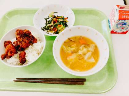 今日は、ごはん、鰹のコロコロ揚げ、野菜の磯あえ、根菜の味噌汁、牛乳です。