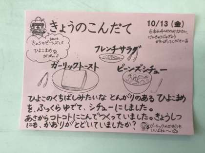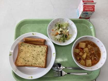 今日の給食は、ガーリックトースト、ビーンズシチュー、フレンチサラダ、牛乳です。まずは、大好きなビーンズシチューを口いっぱいにしました。ほんのりと甘みがあり、ほくほくの食感のひよこ豆を楽しんだ後、さっぱりとしたビネガーの香りのフレンチサラダをいただき、次にガーリックトーストを食べました。ニンニクパワーで週末も元気100倍です!
