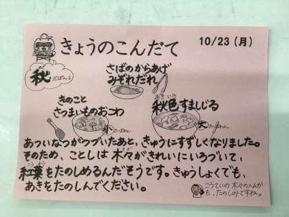 今日の給食は、きのことさつまいものおこわ、サバのから揚げみぞれだれ、秋色すまし汁です。朝はめっきり冷え込み、秋らしくなってきましたが、今日の給食も秋バージョンです。まずは、おこわを一口味わった後、脂ののった秋サバのから揚げを食べました。おろし大根とサバがすごくマッチしてサバっぱりといただけました。最後に黄色く色づいたイチョウの葉っぱの形のかまぼこがたくさんはいったすまし汁をいただき、山の秋、海の秋を存分に楽しみ、すまし汁でも思わず、顔はニンマリです!!