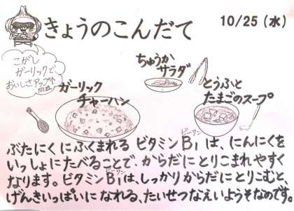 今日は、ガーリックチャーハン、中華サラダ、豆腐と玉子のスープ、牛乳です。