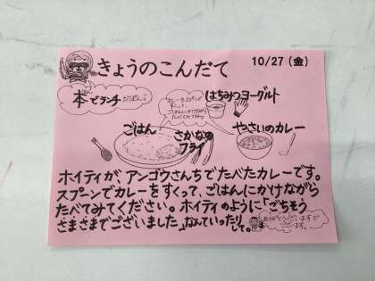 今日の給食は、ごはん、やさいのカレー、さかなのフライ、はちみつヨーグルトです。大好きなカレーを心待ちにしていました。レンズ豆の甘みとカレーのスパイスの辛味がうまくマッチして、美味しい、やさしい味でした。次にさかなのフライを食べました。今日はハッピーフライデー!!