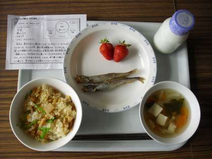 今日は、たけのこごはん、牛乳、焼きししゃも、すまし汁、いちごです。