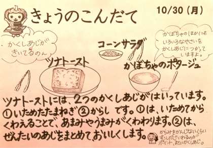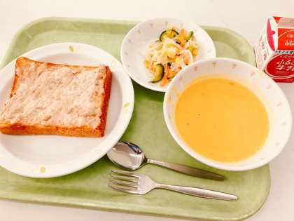 今日は、ツナトースト、コーンサラダ、かぼちゃのポタージュ、牛乳です。