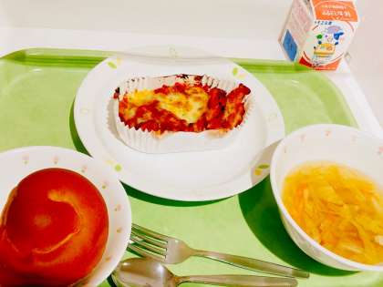 今日は、黒砂糖パン、ペンネミートグラタン、ジュリアンスープ、牛乳です。