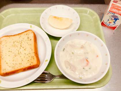 今日は、ガーリックトースト、白菜のクリーム煮、りんご、牛乳です。