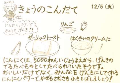 「今日のこんだて」のやまのんは、「にんにくやまのん」になっちゃっています。ゲンコツ山のたぬきさんならぬ、ニンニクやまのんうさぎさんです。