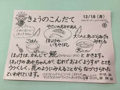 今日の給食は、ごはん、ほっけの一夜干し、野菜のおかかあえ、大根と油揚げのみそ汁、牛乳です。まずは、具沢山のみそ汁をいただき、シャキシャキしたキャベツと鰹節風味の効いた和え物を楽しみました。最後に脂ののった最高に美味しいほっけの一夜干しをいただき、今日もヘルシー感満載の給食で健康管理もバッチリOK(ほっけー)です!!