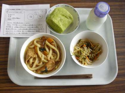 今日は、きつねうどん、牛乳、もやしと昆布の中華和え、抹茶蒸しパンです。