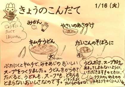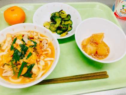 今日は、キムチうどん、大根のそぼろ煮、野菜の浅漬け、みかん、牛乳です。