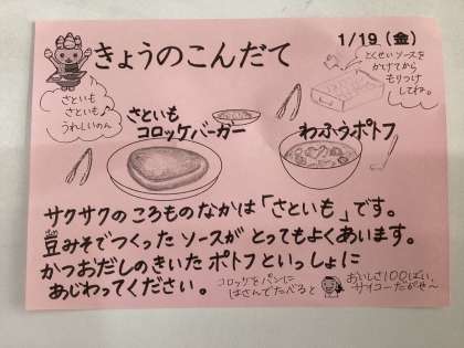 今日の給食は、里芋コロッケバーガー、和風ポトフ、牛乳です。ポトフといえば、フランスの家庭料理で、寒い冬の定番です。山野の和風ポトフも食べやすい大きさの具が沢山あり、真っ先にいただきました。ほっこりしたした気持ちになって、コロッケをパンに挟んでコロッケバーガーをいただきました。そう言えば、大好きなアンパンマンにもハンバーガーキッドにいつも憧れているコロッケキッドがいます。コロッケキッドが作るコロッケバーガーもこんなに美味しいのかな、と想像しながら味わいました。