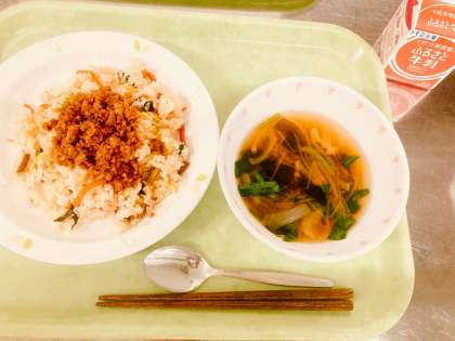 今日は、ビビンバチャーハン、春雨と野菜のスープ、牛乳です。