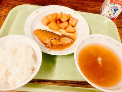 今日は、ごはん、鯖のみそ煮、じゃがいもの煮つけ、かしわ汁、牛乳です。