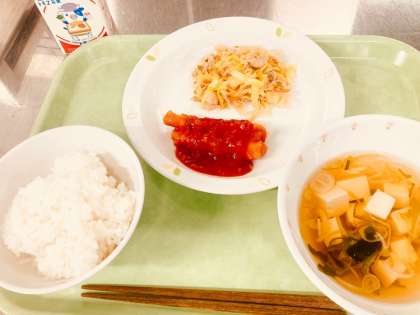 今日は、ごはん、イカのチリソース、春雨の中華いため、豆腐とわかめのスープ、牛乳です。