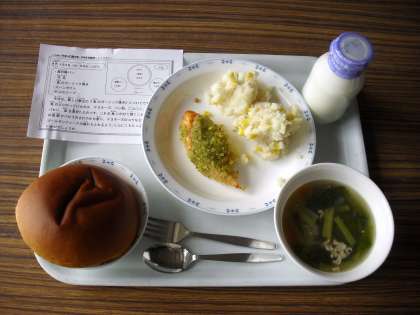 今日は、黒砂糖パン、牛乳、魚のガーリック焼き、コーンポテト、かぶのスープです。