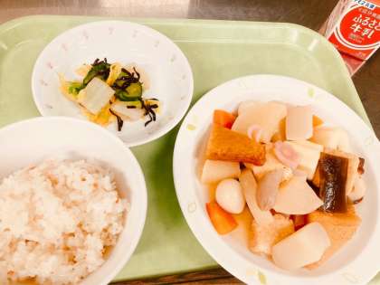 今日は、梅おこわ、おでん、柚子香漬け、牛乳です。