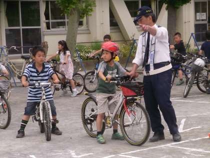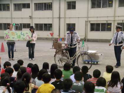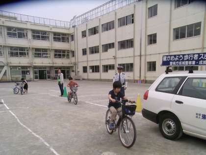 1年生に引き続き、3年生は安全な自転車の乗り方についてです。「ぶ・た・は・しゃ・べる」の合言葉で自転車の安全点検についてお話を伺い、そのあとは、コースに沿って実際に自転車に乗って、気をつけるところを確認しました。特に、いったん停止で曲がるときは、自転車を降りるということは、きっとみんな分かっていなかったことだと思います。ここに来て本当に交通事故が増えています。今日の経験を生かして、絶対に安全な自転車の乗り方をしていってほしいです。ご指導いただいた成城警察の方々に感謝するとともに、3時間もずっとお手伝いをしてくださった保護者の皆様に心から感謝いたします。ありがとうございました。