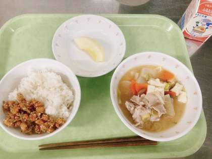 今日の給食は、ごはん、大豆とじゃこの甘辛揚げ、豚汁、りんご、牛乳です。今日は最高気温も上がらず、大変寒いので、まず具沢山の豚汁をいただきました。豚汁は山野小の給食の中でも人気が高いそうです。寒い冬には特にお勧めで、免疫力アップのための栄養がたくさん取れそうです。次に、大豆とじゃこの甘辛揚げをごはんと一緒にいただきました。もちもちごはんの中で、このカリカリとした食感がたまりませ〜ん!大豆とじゃこも大好きじゃ(ダイズきジャ〜)‼︎