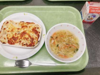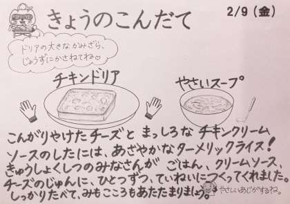 今日の給食は、チキンドリア、野菜スープ、牛乳です。まず、野菜いっぱいのスープを頂いた後、こんがり焼けたチーズのチキンドリアを食べました。美味しい‼︎ チキンクリームソースとライスのコンビネーションが絶妙にマッチして食欲をそそります。ドリアを初めて作った人はどこの国の誰や?と思って調べたら、日本の某ホテルのスイス人の料理長でした。