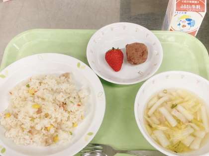 今日の給食は、カラフルピラフ、白菜スープ、ブール・ド・ショコラ、イチゴ、牛乳です。今日はバレンタインーデーで、給食にも山野小学校給食室特製のチョコレートが出ました。チョコにイチゴ、最高のデザートです。チョコレートのショコラはどこの国の言葉か調べたところ、フランス語でした。ボンジュールしか知らなかった私は、もう1語(イチゴ)フランス語を覚えて、ショっコラ賢くなった気分になりました。
