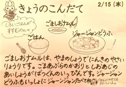 今日は、ごはん、常家豆腐(ジャージャンどうふ)、ごま塩ナムル、牛乳です。