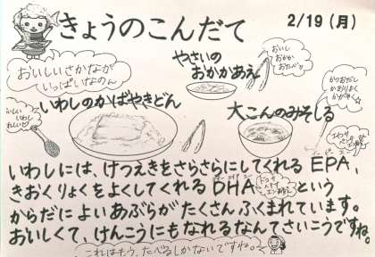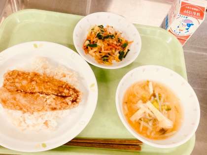 今日は、鰯(いわし)の蒲焼丼、大根のみそ汁、野菜のおかかあえ、牛乳です。