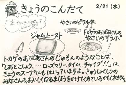 今日は、ジャムトースト、トカゲおばさんのやさいすうぷ、野菜のピクルス、牛乳です。