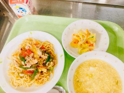 今日は、青椒肉絲焼きそば、辣白菜(ラーパーツァイ)豆腐と玉子のスープ、牛乳です。