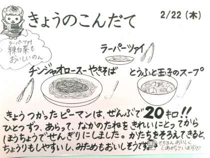 「きょうのこんだて」のやまのん、ピーマンを被っちゃってます。ピーマン2号か?いや、女子なので3号のぴー子かもしれません。