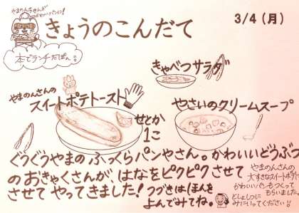 この「口コミ」は、山野小学校のマスコットやまのんにも伝わったようで、やまのんは、美味しいパンが食べたくて、栄養士の先生に大好きなスイートポテトを持ってきました。すると、栄養士の先生は、それを使って、とっても美味しい「スィートポテトースト」を作りました。