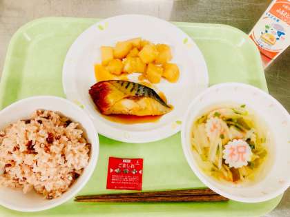 今日は、赤飯、鯖の照り焼き、じゃがいもの煮つけ、お祝いすまし汁、牛乳です。