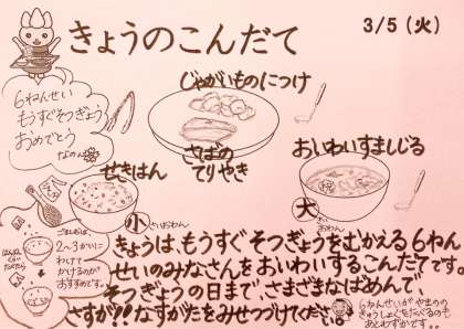 今日は、6年生を送る会があったので、お祝い献立です。送る会でのお祝いを済ましてから、お祝いすまし汁をいただきます。ナルトに「祝い」の文字が入っていて、記念になると思います。