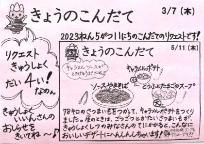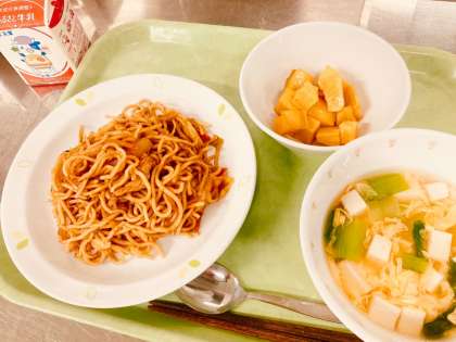 今日は、ソース焼きそば、豆腐と玉子のスープ、キャラメルポテト、牛乳です。