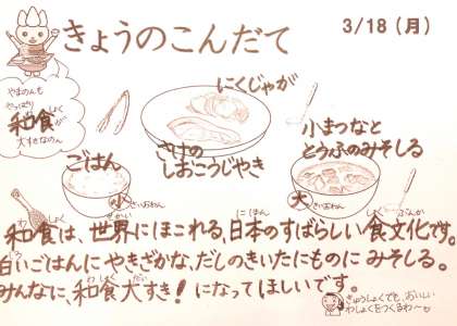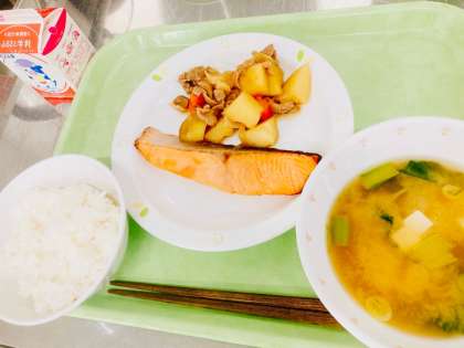今日は、ごはん、鮭の塩麹焼き、肉じゃが、小松菜と豆腐のみそ汁、牛乳です。