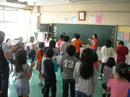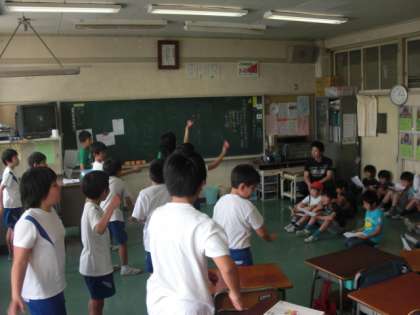 緑組は、5年生がまず見本を示し、それに3年生が付いていく、という