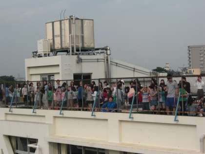 7時32分、校庭と屋上にいる児童や保護者の皆さんから拍手が起こりました。
