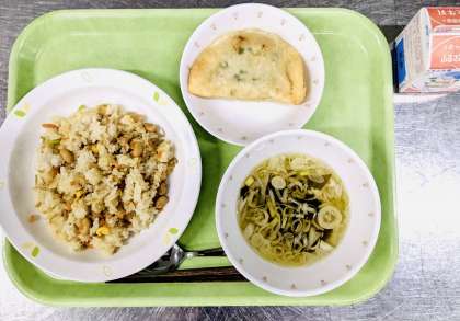 今日は、おまめチャーハン、ジャンボぎょうざ、ねぎとわかめのスープ、牛乳です。