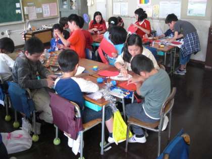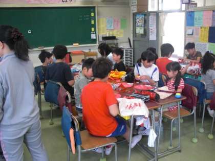 交流グッズ作り・赤(6年1組と1年1組)