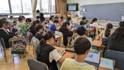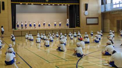 4年生は体育館でエイサーをお互いに見合って仕上げをしています。