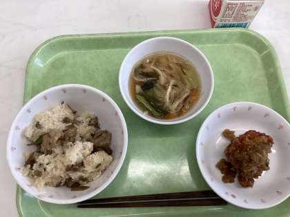 今日の給食は、きんぴらおこわ、鶏肉のから揚げみぞれだれ、沢煮わん、牛乳です。大好物のから揚げはまた食べたいからあげたいリクエスト給食に。野菜具沢山の沢煮わんでビタミン充填し、さわ(ら)には、もちもち感いっぱいの中しっかりした食感のごぼうの入ったきんぴらおこわに大満足。これで、来週のスポーツフェスタのリレーもごぼう抜きだ(ったらいいな〜)‼︎
