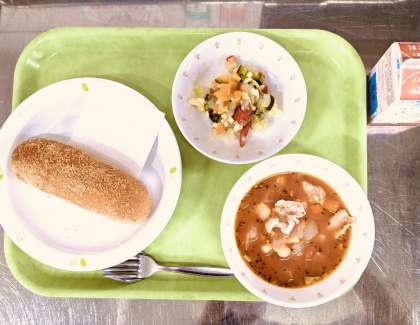 今日は、揚げパン、ミネストローネ、チーズ入りサラダ、牛乳です。