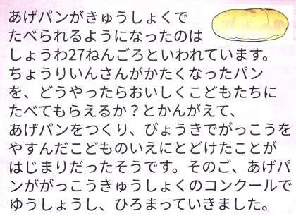 コッペパンの揚げパンを食べるのは、昨年、オギノパンの工場見学に行ったとき以来です。オギノパンは時々、祖師ヶ谷大蔵駅てもアンパンを販売していますが、揚げパンは、揚げたてにこだわっているので、フライヤーがある店舗でしか販売しないそうです。給食の揚げパンも揚げたてなので、とても美味しいです。