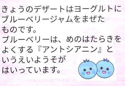今日は、ひよこ豆のドライカレー、グリーンサラダ、ブルーベリーヨーグルト、牛乳です。