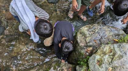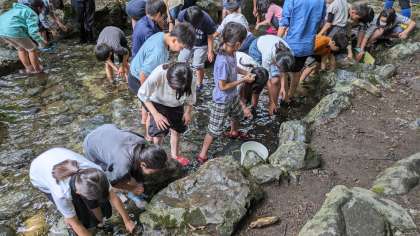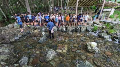 クラスごとにマスつかみをしました。水は冷たく、マスはすばしっこいです。少しずつ捕まえられるようになってきました。