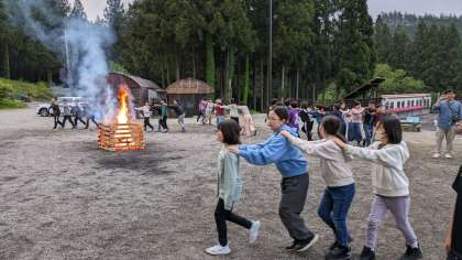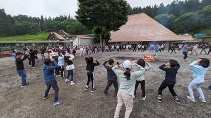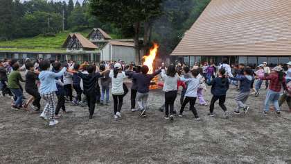 日の入りが遅いので、ちょっと明るいですが、キャンプファイヤーを始めました。友情・情熱・希望の火をもらって、ゲームや歌、踊りを楽しみました。