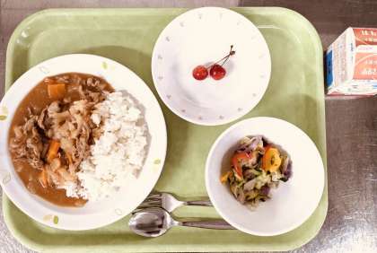今日は、ハヤシライス、フレンチサラダ、果物(さくらんぼ)、牛乳です。