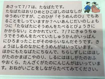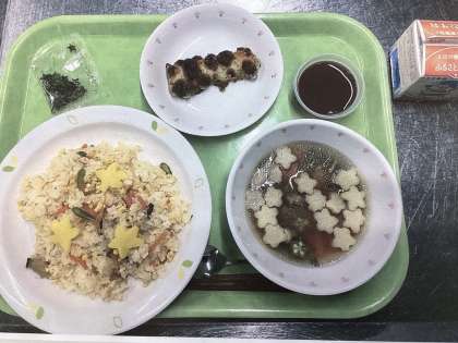 今日の給食は、ちらし寿司、竹輪の磯辺揚げ、七夕汁、ぶどうゼリー、牛乳です。明後日は七夕で、今日は七夕メニューです。美味しいメニューが勢揃いで朝から待ちきれずに気がちらし寿司って感じでした。ちらし寿司や七夕汁にはたくさんのほし形のかまぼこ、のり、おふが入っていてとても嬉しかったです。みんな「もっとほしー!」って言うと思います。