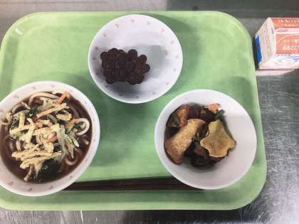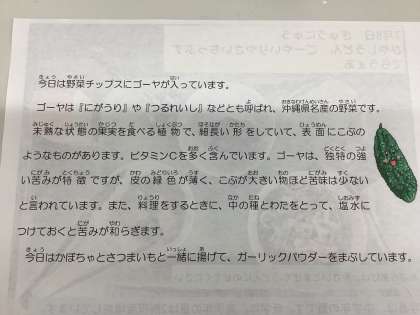今日の給食は、冷やしうどん、ゴーヤ入り野菜チップス、果物(デラウェア)、牛乳です。暑い日に冷やしうどんは嬉しいです。ゴーヤも高い栄養効果があり、夏バテ改善に効くそうです。ゴーヤはニガウリとも言います。大好きなアンパンマンに正義の流れ者ニヒルなニガウリマンが登場し、ばいきんまんをやっつけてくれます。わたしもゴーヤパワーでこの暑さをやっつけて、暑さに「バイバイキーン!!」と言わせようと思います。