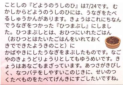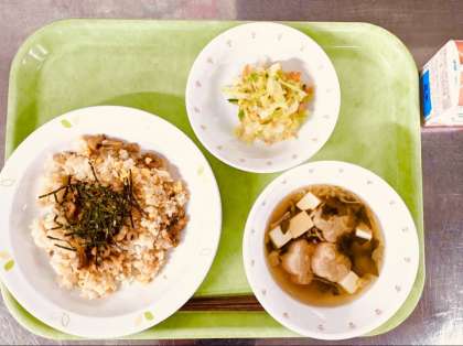 今日は、ひつまぶし、キャベツとみょうがのサラダ、すまし汁、牛乳です。
