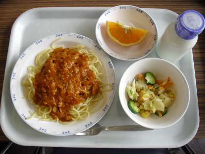 今日は、スパゲティーミートソース、牛乳、ポテト入りフレンチサラダ、清美オレンジです。