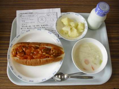 今日は、セルフチリサンド(スライス入りコッペパン、ウインナーのチリソース)、牛乳、キャベツのクリームスープ、粉ふきいもです。